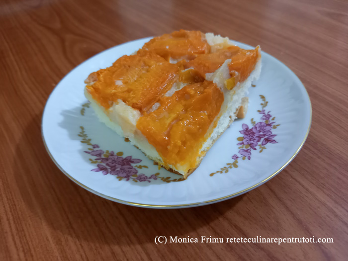 – 5 ouă, 150 g zahăr+3 linguri, 1 plic zahăr vanilat, 150 g făină, 700 g caise, margarină, sare, zahăr praf
