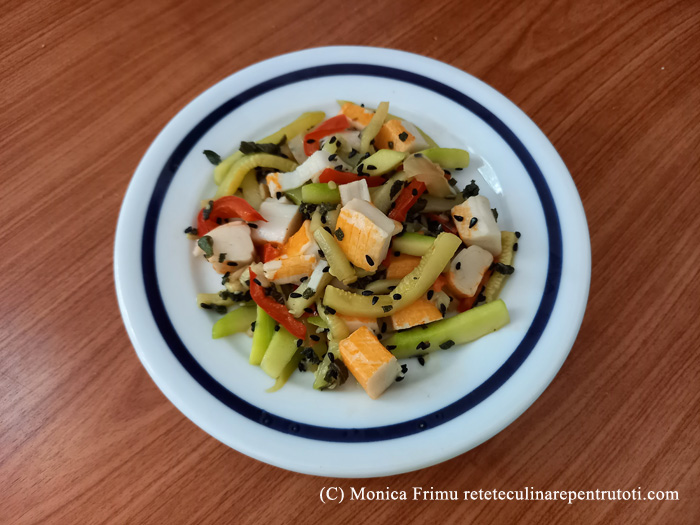 – 8 surimi (130 g), 4 g usturoi, 500 g ardei colorați tăiați felii, 1 dovlecel (200 g), 1 lingură semințe de chimen negru, 1 lingură salvie tocată mărunt,½ linguriță boabe de piper verde, ½ linguriță sare, 1 lingură ulei