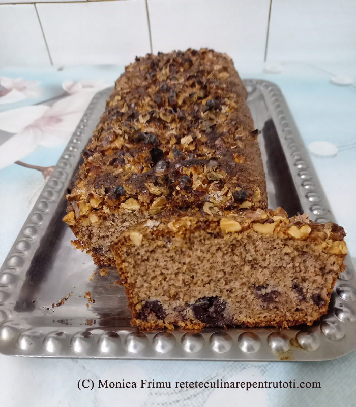 Măcinăm 100 g nuci, restul de 50 g tăiem cu cuțitul și amestecăm cu zahărul vanilat. Amestecăm pesmetul cu făina, praful de copt și nucile măcinate. Scurgem vișinele și presărăm 2 linguri din amestec. Mixăm albușurile spumă tare cu un praf de sare. Mixăm gălbenușurile cu zahărul până își dublează volumul, punem amestecul de nuci cu pesmet și omogenizăm. Încorporăm vișinele și albușurile, amestecând cu o lingură. Turnăm într-o formă de chec (30×12 cm) tapetată cu hârtie de copt. Deasupra presărăm nucile tăiate. Punem în cuptorul preîncălzit la foc mediu (180) 30 minute (testul cu scobitoarea). Răcim, îndepărtăm hârtia, tăiem felii și servim.