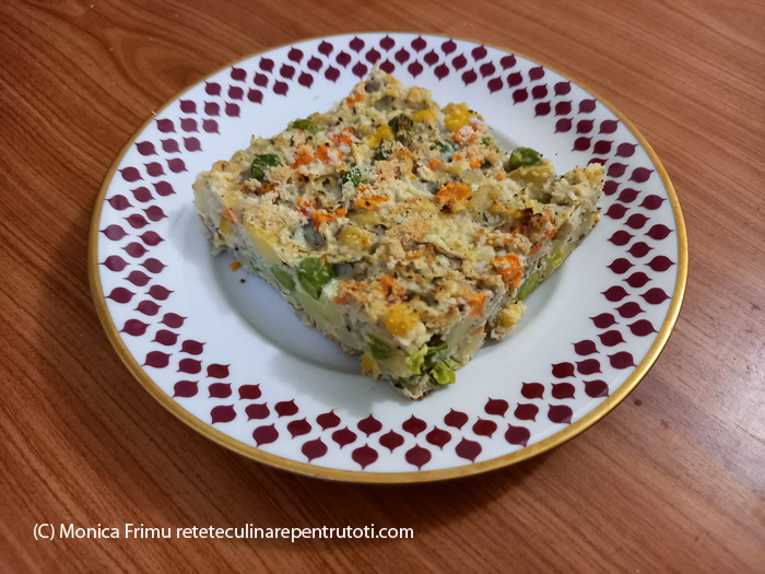– 3 ouă, 400 g cartofi fierți în coajă, 200 g amestec de legume congelate (mazăre, morcov, porumb), 200 g varză dulce, 1 linguriță cimbru uscat, 30 g brânză rasă pentru paste, ½ piper negru măcinat, sare; pentru formă- margarină și pesmet