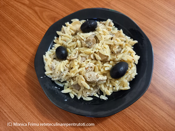 – 250 g paste Kritharaki, 4 pulpe inferioare de pui fierte în supă, 100 g ceapă, 100 g ciuperci feliate din conservă, 200 g iaurt, câte 1 linguriță oregano uscat, semințe de coriandru și mix usturoi, chilli și oregano uscate, ¼ linguriță piper negru măcinat, 20 g brânză rasă pentru paste, sare, 1 lingură ulei, 1,5 l apă