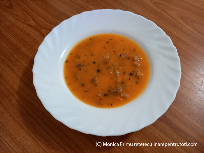 Curățăm rădăcinoasele, tăiem bucăți, punem într-o oală, adăugăm cubul concentrat, turnăm apa și fierbem, acoperit parțial, până se înmoaie. Le scoatem din supă, răcorim, pasăm, turnăm în oală și punem pe foc mediu. Tăiem mărunt jambonul, punem în oală și fierbem până începe să clocotească. Separat încălzim uleiul, punem piperul chimenul și prăjim 30 sec. Turnăm în oală, amestecăm și stingem focul. Porționăm și servim.