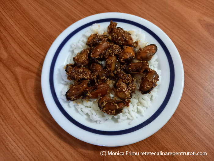 – 300 g midii decorticate congelate, 4 g usturoi, 1 linguriță praf de ghimbir, 2 linguri sos teriyaki, câte 1 linguriță sos de soia light și oțet de orez, 1 linguriță zahăr brun, ¼ linguriță piper alb măcinat, 1 lingură semințe de susan alb, 1 lingură ulei de susan