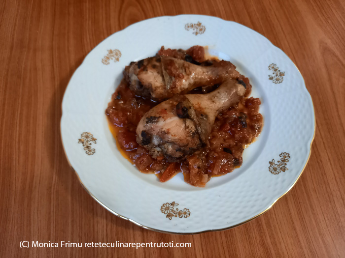 – 8 pulpe inferioare de pui (cca. 850 g), 150 g ceapă, 1 conservă roșii tăiate (400 g), 50 g măsline negre fără sâmburi, 1 lingură Belșug de mirodenii, 1 linguriță oregano uscat, 1 linguriță zahăr, ¼ linguriță piper negru măcinat, sare, 3 linguri ulei, sare, apă