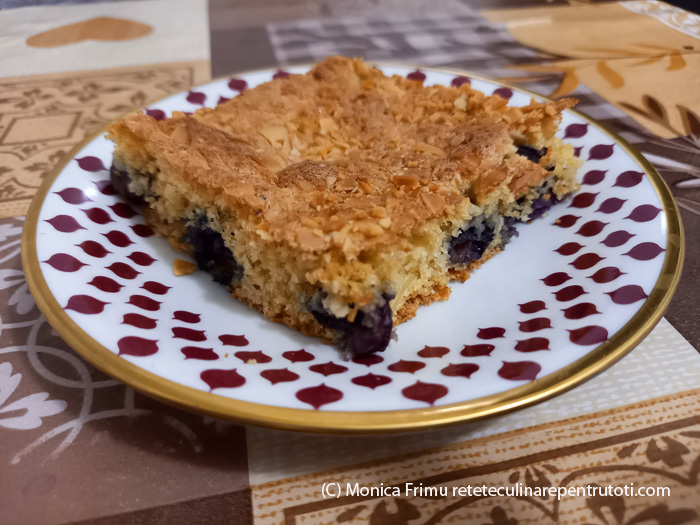 Zdrobim fulgii de migdale. Amestecăm pesmetul cu praful de copt. Mixăm albușurile spumă tare cu un praf de sare, adăugăm zahărul, zahărul vanilat și mixăm până devin cremoase și lucioase. Punem pe rând gălbenușurile, pesmetul, 50 g fulgi de migdale și omogenizăm. Tapetăm o tavă (32×22 cm) cu hârtie de copt și întindem uniform compoziția. Deasupra presărăm afinele, peste fulgii de migdale rămași. Punem în cuptorul preîncălzit la foc mai mare (200) până se dezlipesc marginile de pe hârtie, cca.15-20 minute (testul cu scobitoarea). Răcim, îndepărtăm hârtia, porționăm și servim.