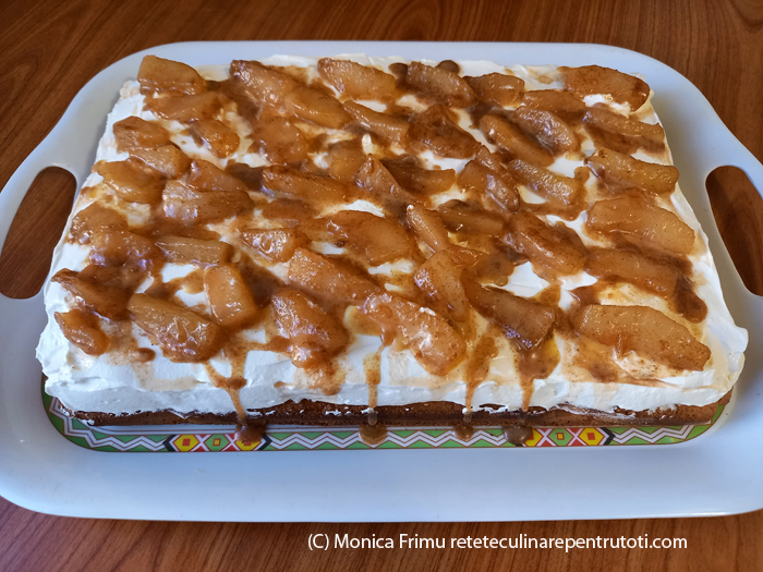Mixăm frișca tare. Amestecăm ricotta cu zahărul praf, apoi cu frișca și punem în frigider. Curățăm perele de coajă și cotorul cu semințe, una dintre ele o tăiem cubulețe, celelalte felii de 0,5 cm grosime. Mixăm albușurile spumă tare cu un praf de sare, adăugăm zahărul brun și mixăm până devin cremoase și lucioase. Punem pe rând gălbenușurile, făina, cubulețele de pară și amestecăm cu o lingură până omogenizăm. Tapetăm o tavă (32×22 cm) cu hârtie de copt și întindem uniform compoziția. Punem în cuptorul preîncălzit la foc mai mare (200) cca. 20 min. (testul cu scobitoarea). Răcim, îndepărtăm hârtia și așezăm pe un platou/tavă. Într-o cratiță largă topim untul cu zahărul tos, punem feliile de pere, presărăm scorțișoara și fierbem pe foc mediu, amestecând din când în când, până se formează un sos gros și se înmoaie perele, cca. 20-25 min., apoi răcim. Întindem peste blat crema din ricotta, acoperim cu perele caramelizate și stropim cu sosul format. Punem în frigider câteva ore, porționăm și servim.
