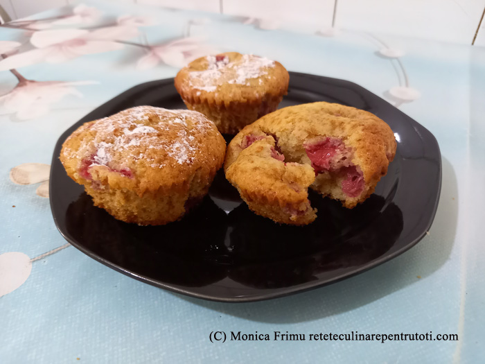 Mixăm untul cu zahărul până devin spumoase. Adăugăm pe rând ouăle, făina, praful de copt, iaurtul și omogenizăm. Tăiem căpșunile cubulețe și le încorporăm în compoziție, amestecând ușor cu o lingură. Tapetăm cu hârtiuțe formele unei tăvi pentru brioșe. Le umplem ¾ cu compoziția. Punem în cuptorul preîncălzit la foc mediu (180) 15-20 minute, până se rumenesc. Răcim, îndepărtăm hârtiuțele, presărăm zahăr praf și servim.