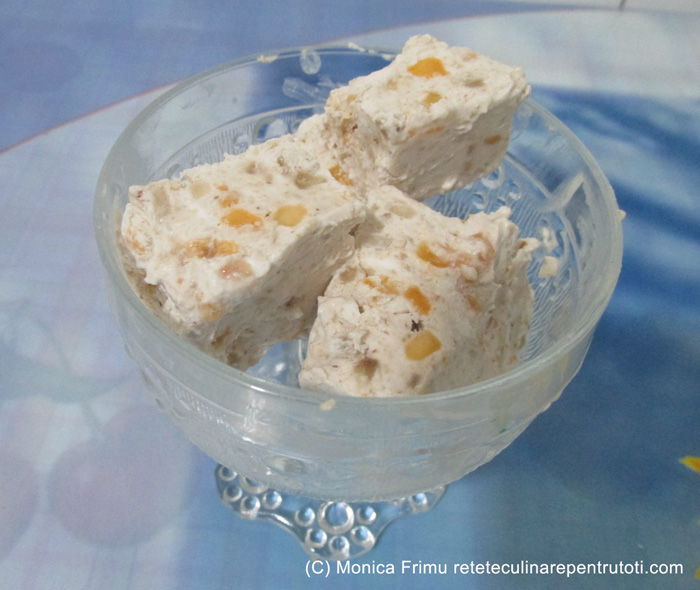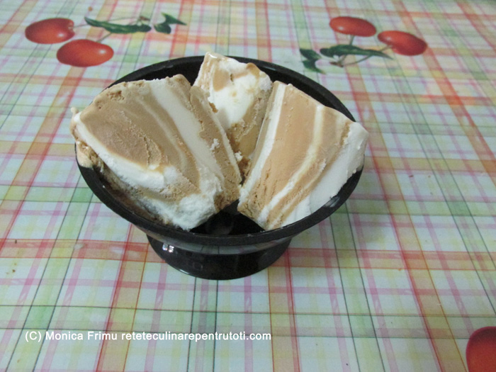 Mixăm albușurile spumă tare, adăugăm zahărul și mixăm până devin lucioase și cremoase. Mixăm frișca tare. Amestecăm 3 gălbenușuri cu o lingură de albușuri, 1 lingură de frișcă și esența de vanilie și 3 gălbenușuri cu 1 lingură de frișcă, 1 lingură de albușuri și cacaoa. Împărțim albușurile și frișca ½ și amestecăm în cele două compoziții. Într-o cutie de plastic alternăm după fantezie cele două compoziții. Acoperim cu capac și punem în congelator până a doua zi. Ținem la temperatura camerei 5 minute, porționăm și servim.