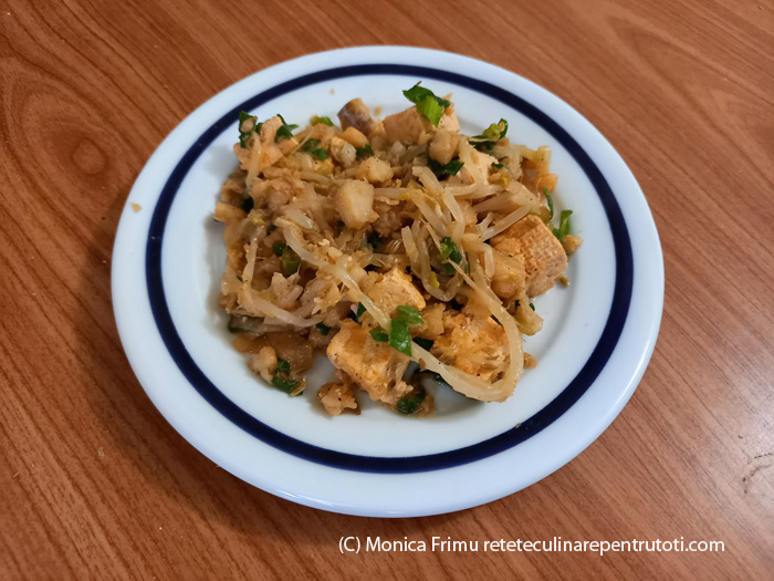 Scurgem bine tofu, tăiem cuburi cu latura de 1 centimetru, presărăm condimentele pentru brânză, amesteăm și lăsăm să stea 30 minute. Tăiem peștele mărunt și amestecăm cu masala pentru pește. Curățăm ceapa și tăiem partea albă mărunt, cozile fâșii subțiri pe diagonală. Scurgem mugurii de fasole. Într-o tigaie antiaderentă încălzim uleiul pe foc mare, punem semințele de chimion și fenicul, partea albă a cepei și amestecăm 1 minut. Adăugăm peștele, piperul, apa, reducem flacăra la mediu și fierbem 2 minute. Punem tofu, ½ linguriță sare și gătim 3 minute. Adăugăm mugurii de fasole, cozile de ceapă, sărăm după gust și amestecăm din când în când 5 minute. Porționăm și servim cu orez fiert simplu.