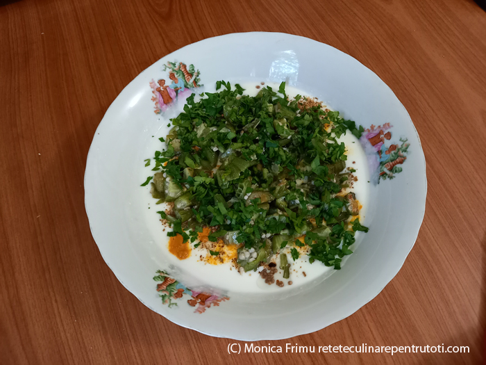 – 200 g bame congelate, 400 g iaurt, câte 1 linguriță zahăr, semințe de muștar, piper Cayenne și sare, ¼ linguriță turmeric, 3 linguri ulei de arahide, 2 linguri coriandru tocat mărunt, apă