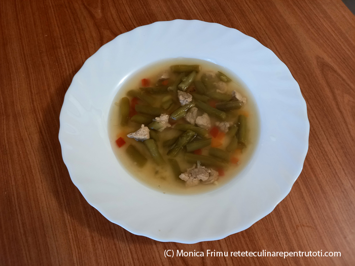 Curățăm usturoiul, ghimbirul și tăiem mărunt. Tăiem carnea cubulețe. Clocotim apa cu concentratul de supă, punem fasolea verde și fierbem 5 minute. Adăugăm carnea, usturoiul, ghimbirul și fierbem 15 minute. Punem ardeiul și gătim 3 minute. Presărăm praful de borș, amestecăm și fierbem 3 minute. Porționăm și servim.
