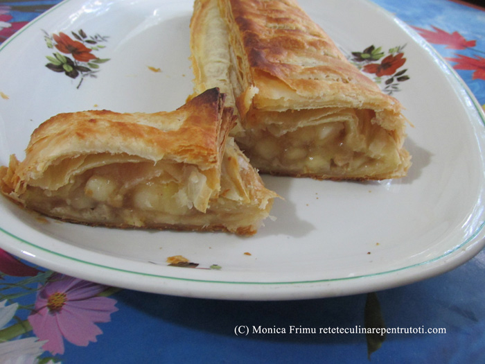 Decongelăm aluatul. Curățăm merele și tăiem cubulețe, punem într-o cratiță adăugăm zahărul, zahărul vanilat și fierbem pe foc mediu până se înmoaie, amestecând  din când în când aproximativ 10-15 minute. Transferăm într-un bol, răcim, adăugăm scorțișoara, nucile și omogenizăm. Întindem aluatul și punem merele de-a lungul unei margini lungi. Aluatul rămas neacoperit în crestăm fără să tăiem marginea. Întoarcem partea de aluat tăiată peste mere și presăm bine marginile. Așezăm într-o tavă tapetată cu hârtie de copt. Batem bine oul și ungem suprafața aluatului. Punem în cuptorul preîncălzit la foc mediu aproximativ 20-25 minute, până se rumenește. Răcorim, scoatem pe un platou, tăiem felii și servim.