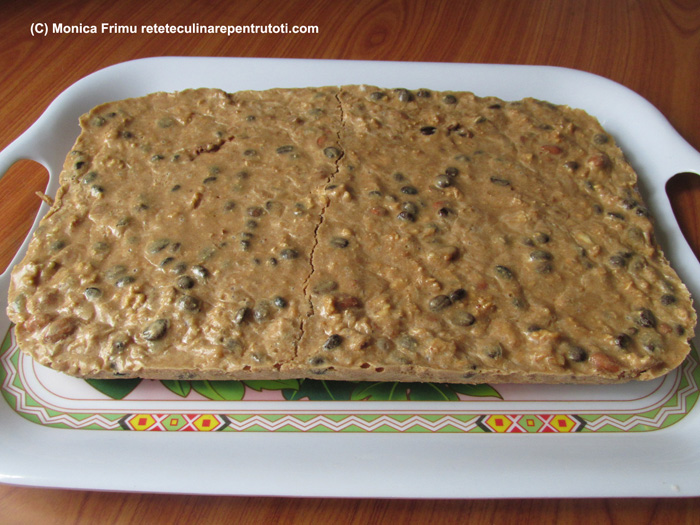 Punem în cuptorul preîncălzit, la foc mediu, aprox. 30 min. Răcim, scoatem din formă, feliem și servim.