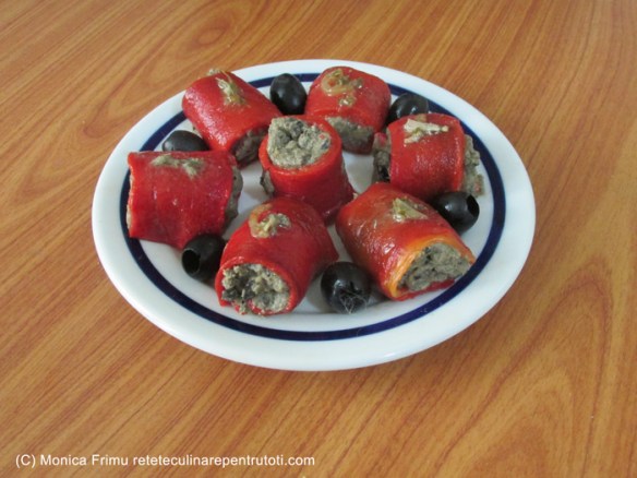 Prăjim ardeii pe plită, răcim, curățăm de coajă și cotorul cu semințe și tăiem fâșii de 5-6 cm lățime. Scurgem peștele și mărunțim. Pasăm caperele. Curățăm usturoiul și tăiem fin. Șapte măsline punem de o parte restul tăiem mărunt. Amestecăm peștele anșoa cu usturoiul, măslinele, caperele, busuiocul, 1 lingură zeamă din conservă și omogenizăm. Pe fiecare fâșie de ardei întindem compoziția obținută. Rulăm, așezăm pe o farfurie, ungem cu puțină zeamă din conservă, ornăm cu măslinele puse de o parte și servim. Putem păstra în frigider.