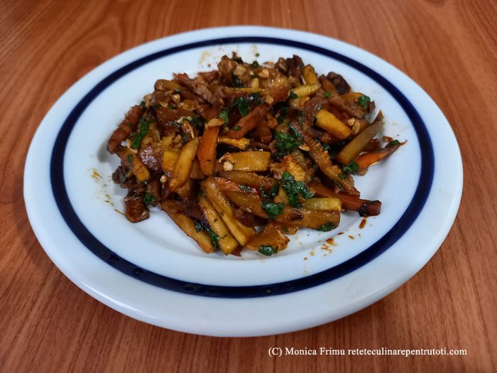 Curățăm și tăiem dovleceii și morcovul bastonașe subțiri, usturoiul mărunt; tocăm mărunt pătrunjelul. Tăiem șunca bastonașe subțiri. Într-o cratiță încălzim uleiul pe foc mare și prăjim usturoiul 30 secunde. Punem morcovul și amestecăm 2 minute. Adăugăm dovleceii, șunca, sosul de soia, acoperim cu capac, reducem flacăra la mediu și gătim 5 minute. Punem pătrunjelul, arahidele, piperul, dacă e necesar sare (! sosul Tamari e foarte sărat) și amestecăm 1 minut. Servim mâncarea caldă.