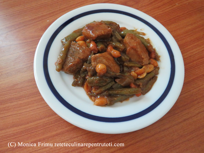 Curățăm usturoiul și tăiem mărunt. Tăiem carnea cuburi, o amestecăm cu 1 linguriță mix mirodenii, 1 lingură ulei și lăsăm să stea 15 minute. Într-o tigaie teflonată încălzim 1 lingură de ulei pe foc mare și prăjim usturoiul 30 secunde. Punem carnea, reducem flacăra la mediu, prăjim până își schimbă culoarea și începe să se înmoaie, aproximativ 5-7 minute. Adăugăm fasolea, 1 linguriță mix mirodenii, turnăm 100 ml apă, acoperim cu capac și fierbem 30 minute. Descoperim, adăugăm arahidele și amestecăm 2 minute. Punem sosul, sărăm după gust și amestecăm din când în când 3 minute. Servim mâncarea caldă.