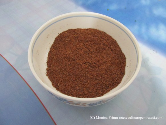 – 2 păstăi mici de cardamom negru, 4 linguri semințe de coriandru, 1 lingură boabe de piper negru, ¾ lingură semințe de fenicul, 5 ardei iuți, 1 baton de scorțișoară (5 cm lungime), 6 cuișoare, 1 lingură praf de mango