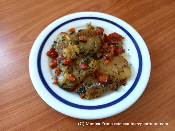 – 500 g file de pește alb, 100 g ardei gras roșu, 8 g frunze de mentă, 1 lingură ulei, 1 linguriță piper negru cu lămâie măcinat, sare de mare, 50 ml apă