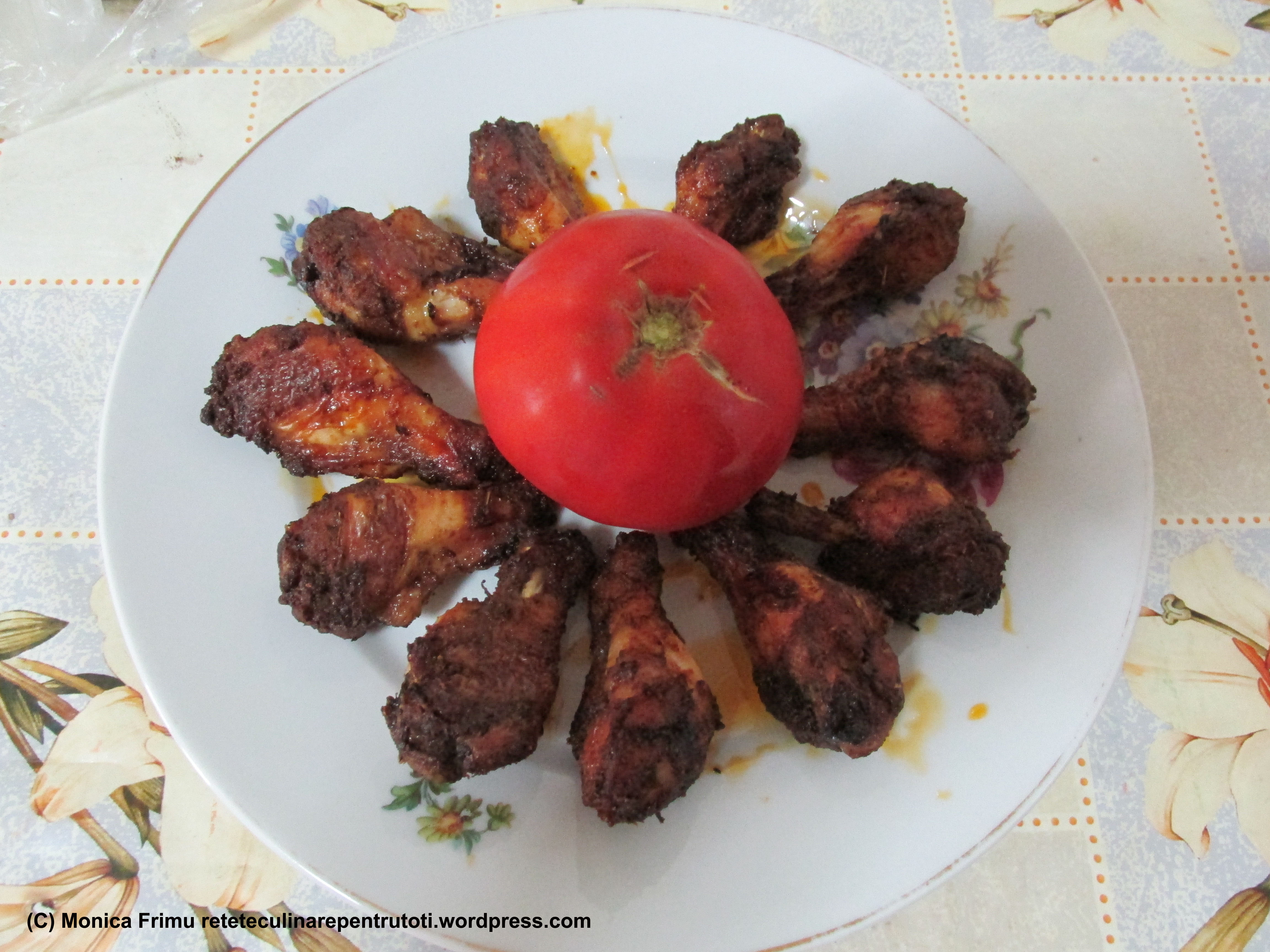 Fierbem aripile în apă clocotită 20 min., scurgem și marinăm 1 oră într-un amestec din 2 linguri sos de soia, 1 lingură de ulei, usturoiul curățat și pisat, ghimbirul curățat și tăiat mărunt. Scoatem din marinadă (o păstrăm) și prăjim în 2 linguri de ulei, pe ambele părți, până se rumenesc și scoatem deoparte pe hârtie absorbantă. Curățăm și tăiem ceapa verde mărunt. Aruncăm uleiul şi punem aripile, ceapa verde, supa, marinada, 1 lingură sos de soia+/-sare și fierbem 5 min. La sfârşit punem făina de mălai amestecată cu puţină supă și amestecăm până se îngroașă sosul.