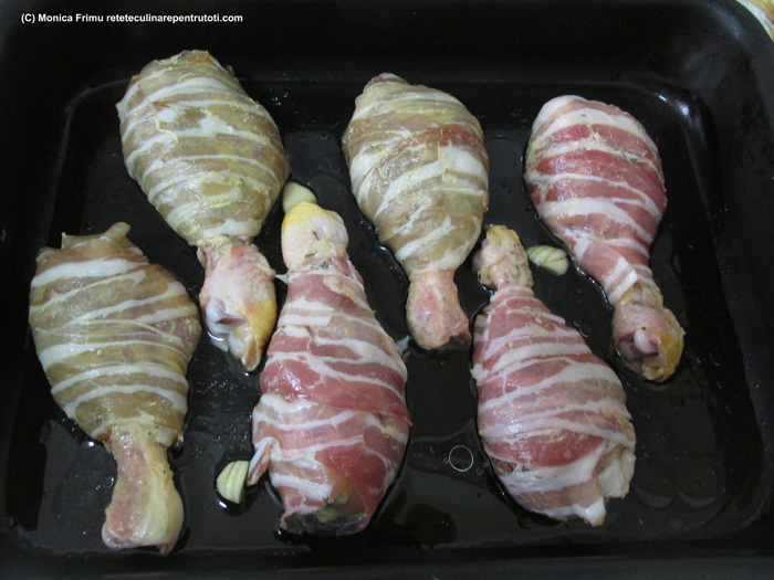Acoperim cu folie de aluminiu și punem în cuptor, la foc mediu, aprox. 40 min. Scoatem folia și mai ținem în cuptor aprox. 10 min., până se rumenește carnea.