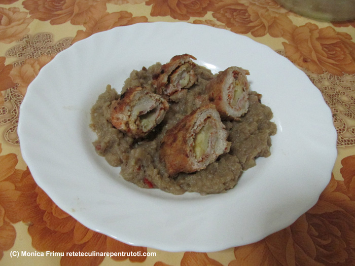 Le scoatem pe o farfurie, merele le facem pastă cu blenderul, amestecăm cu puțin suc de mere formând un piure. Servim rulou de carne cu piure de mere.