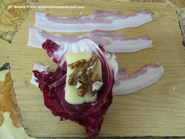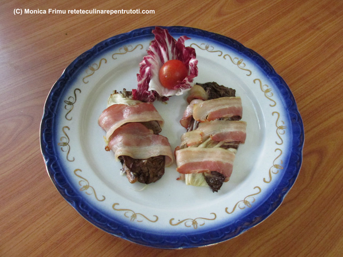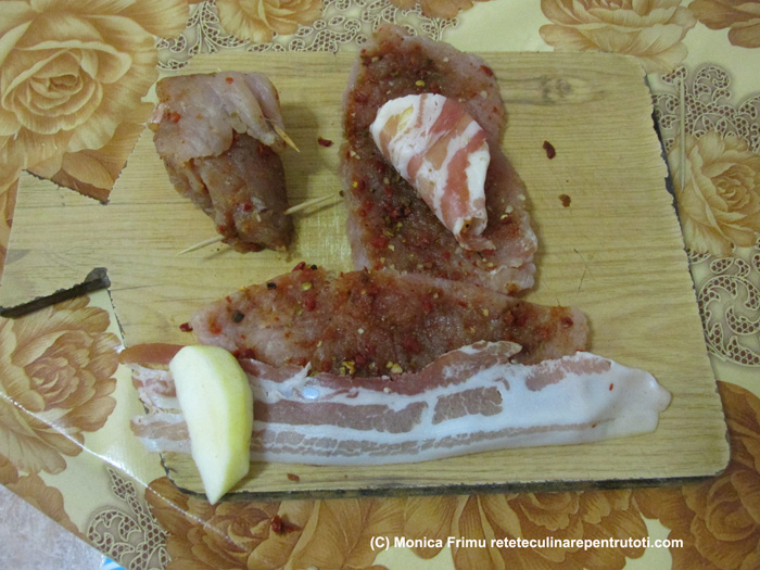 Scoatem și tăiem în 3 bucăți. Curățăm merele de coajă și cotor. Jumătate de măr îl tăiem în felii. Fiecare felie o învelim în bacon, o așezăm pe o felie de carne, pe care o pliem și o prindem cu scobitori.