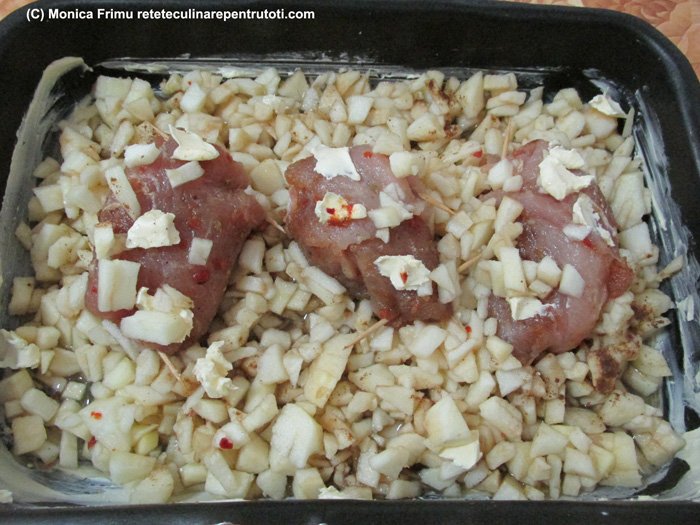 Restul merelor le tăiem cubulețe mici din care ¾ le întindem într-un strat pe fundul unei tăvi unsă bine cu unt și presărăm cuișoare. Așezăm cele 3 rulouri de carne, deasupra presărăm restul de mere, presărăm cuișoare și pe carne punem bucățele de unt. Turnăm vinul.