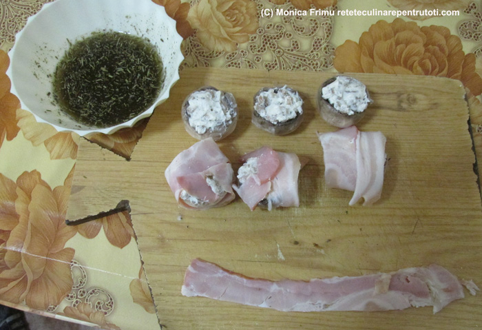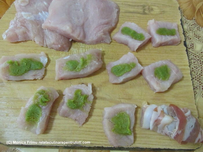 Batem cu ciocanul carnea formând un dreptunghi de 1 cm grosime pe care îl presărăm cu marinadă pe ambele părți.