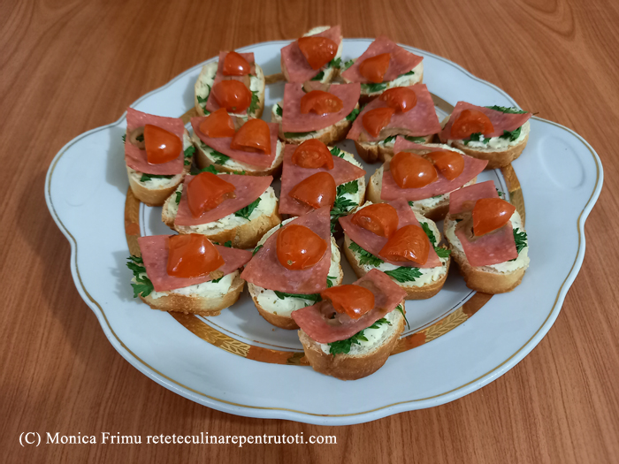 Tăiem bagheta rondele de 1 cm grosime, mortadella felii de mărimea rondelelor. Ungem rondelele cu cremă de brânză, presărăm frunze de pătrunjel și acoperim cu felii de mortadella. Tăiem roșiile ½ sau ¼ în funcție de mărimea lor și așezăm pe fiecare rondea cu partea tăiată în jos. Tapetăm o tavă cu hârtie de copt pe care o ungem cu ulei. Așezăm rondelele la distanță una de cealaltă. Punem în cuptorul preîncălzit la foc mai mare (200) 10 minute. Servim imediat.