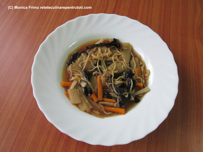 Hidratăm ciupercile 10 min. în apă fierbinte şi le tăiem fâşii.