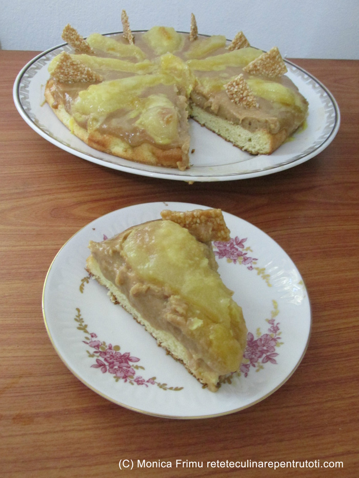 Măcinăm batoanele de susan. Pe un platou așezăm o foaie de blat și întindem 2/3 cremă. Acoperim cu a doua foaie de blat, întindem restul de cremă și presărăm susanul pe toată suprafața. Punem în frigider până a doua zi. Porționăm și servim.