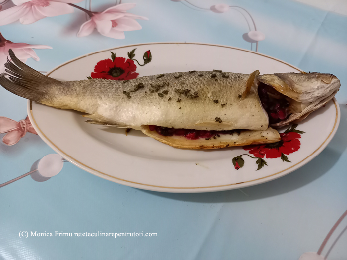 Ungem o folie de aluminiu cu ulei. Amestecăm semințele de rodie cu ½ lingură salvie. Presărăm la exteriorul și interiorul peștelui piperul și ½ linguriță sare. Ungem la exterior cu ulei. Umplem cu amestecul de rodie și salvie. Așezăm pe folie, deasupra presărăm restul de salvie. Împachetăm folia lăsând un spațiu deasupra peștelui. Punem în cuptorul preîncălzit la foc mediu 20 minute. Desfacem folia și punem în cuptor 3 minute. Servim imediat.