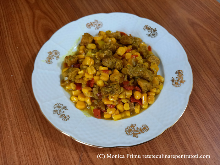 – 150 g mazăre congelată, 1 conservă boabe de porumb (285 g net), 100 g ceapă roșie, 1 gogoșar (120 g), 1 morcov mic (50 g), 100 g iaurt, 1 linguriță amidon alimentar, 1 linguriță semințe de coriandru, 1 linguriță zahăr praf vanilat, câte ½ linguriță piper negru măcinat și boia de ardei iute, sare, 1 lingură pătrunjel verde tocat mărunt, 2 linguri ulei, apă