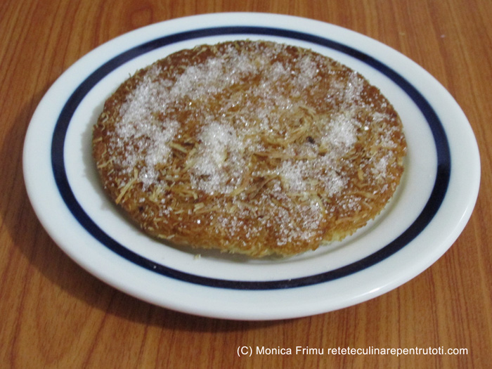 Fierbem apa cu zahărul 10-15 min. obținând un sirop pe care îl răcim. Rupem tăițeii bucățele. Mărunțim brânza. Într-o tigaie topim untul, punem tăițeii și amestecăm continuu până devin aurii. Turnăm laptele și amestecăm până omogenizăm. Vom folosi vase Yena rotunde mai mici pe care le ungem cu unt. Porționăm tăițeii, din jumătate punem un strat în vase și aplatizăm apăsând cu o spatulă/cu mâinile. Acoperim cu brânză pe care o presăm bine. Punem al doilea strat de tăiței și presăm bine. Punem vasele în cuptorul preîncălzit la foc puțin mai mare (190), aproximativ 45 min, până suprafața devine maronie. Scoatem din cuptor, turnăm pe toată suprafața sirop, lăsăm să stea 5 min., scoatem pe farfurii și servim presărate cu zahăr vanilat/fistic, migdale, etc. tăiate mărunt.