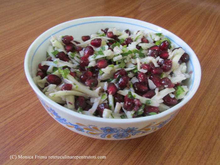 Tăiem rodia, scoatem semințele și le curățăm de pielițele albe. Radem mare brânza. Le amestecăm într-un bol cu pătrunjelul, uleiul, sare și piper după gust. Putem păstra în frigider acoperită.