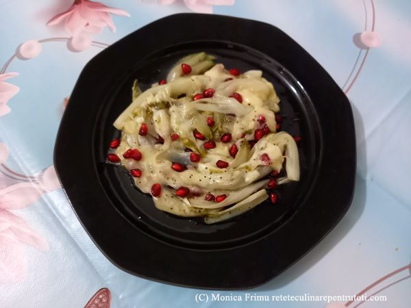 – 1 andivă (150 g), 50 g brânză Edam, 2 linguri semințe de rodie, zahăr, 1 linguriță oțet de mere, 1 lingură oțet, sare, ½ linguriță piper negru cu lămâie măcinat, 1 lingură ulei, apă