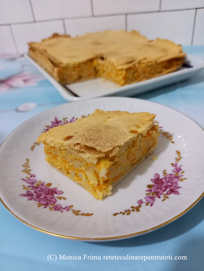 Ungem o tavă (26×18 cm) cu unt și tapetăm cu făină. Împărțim aluatul 2/3 și 1/3 și întindem 2 foi de dimensiunea tăvii. Așezăm în tavă foaia mai mare, o înțepăm din loc în loc cu dinții unei furculițe, punem umplutura într-un strat uniform, acoperim cu a doua foaie de aluat și o înțepăm la fel ca pe precedenta. Punem în cuptorul preîncălzit la foc mediu (180) 35-40 minute, până începe să se rumenească. Servim caldă sau rece.