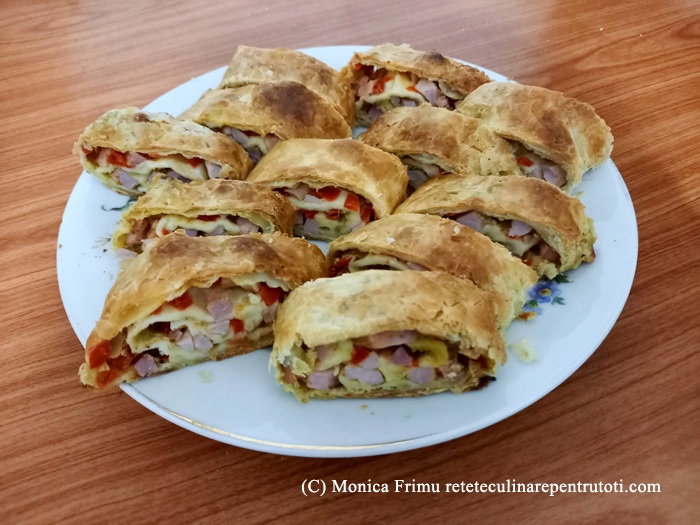 Decongelăm aluatul. Tăiem șunca cubulețe. Curățăm ardeiul de cotorul cu semințe, îl tăiem mărunt și amestecăm cu șunca. Ungem aluatul cu pesto, presărăm amestecul cu șuncă, deasupra brânza, rulăm strâns pe lățime și închidem capetele prin presare. Tapetăm o tavă cu hârtie de copt și o ungem cu ulei. Ungem exteriorul foietajului cu ulei și așezăm în tavă. Punem în cuptorul preîncălzit la foc mai mare (200) până se rumenește, aproximativ 25 minute. Răcim, tăiem felii și servim.