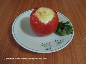 Tăiem capacul, scobim roșiile și îndepărtăm miezul. Sărăm puțin, în fiecare punem o bucățică mică de unt și le așezăm într-o tavă unsă bine cu unt. Punem în cuptorul preîncălzit la foc mare 10 min. Între timp batem ouăle bine cu un praf de sare, turnăm laptele și amestecăm. Topim 1 lingură de unt într-o tigaie, când e fierbinte turnăm ouăle și amestecăm până încep să se întărească. Scoatem roșiile din cuptor, le umplem cu ouă, deasupra presărăm brânză rasă. Le punem înapoi în cuptor, câteva minute, până se topește brânza. Servim imediat.