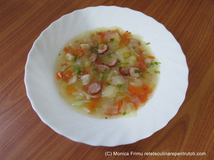 – 300 g varză roșie, 100 g legume pentru supă congelate, 1 cabanos (cca. 80 g), 2 fire ceapă verde, 1 frunză de dafin uscată, 1 lingură praf de borș, 2 linguri ulei, ½ linguriță piper negru măcinat, sare, 1,2 l apă