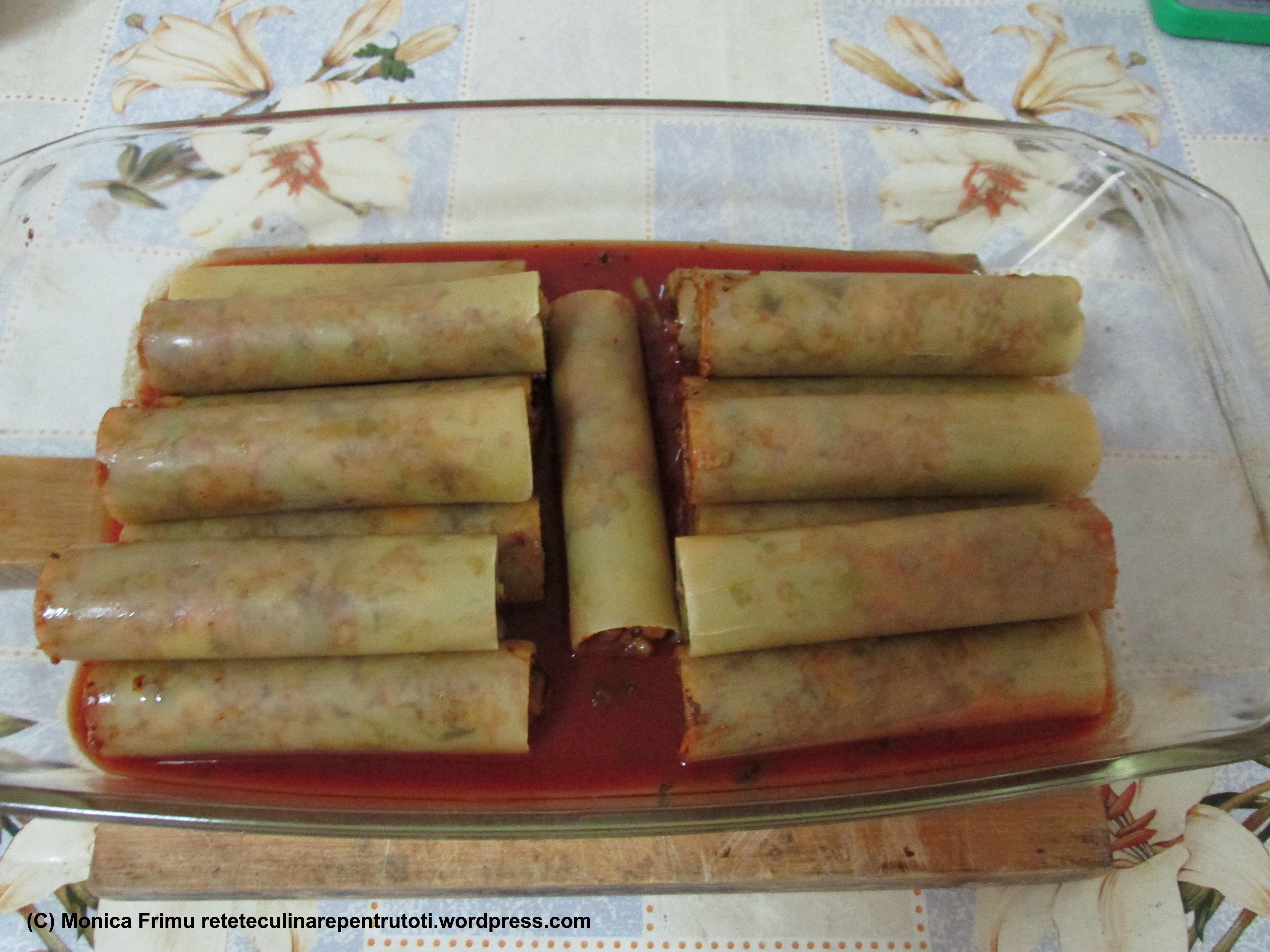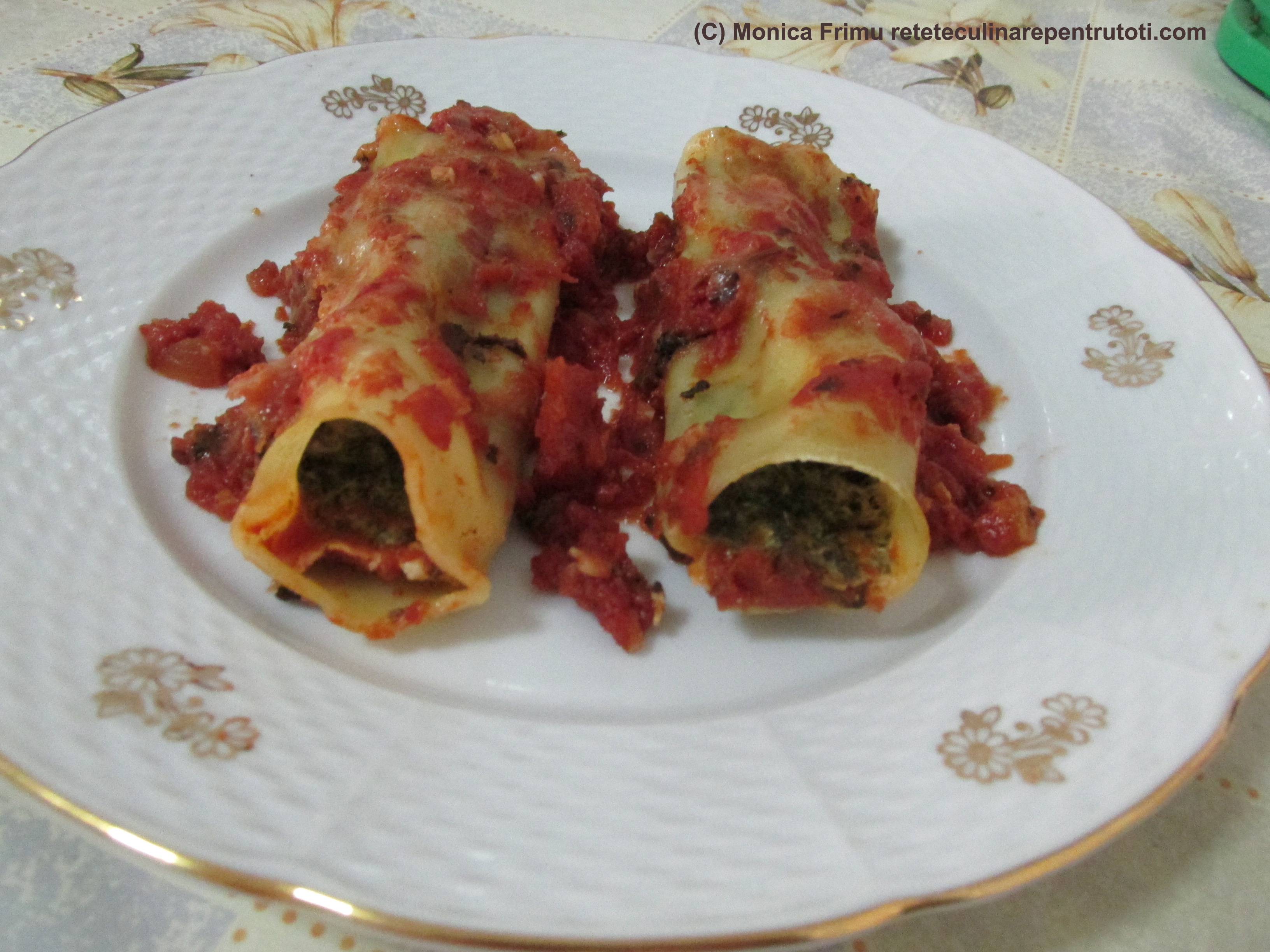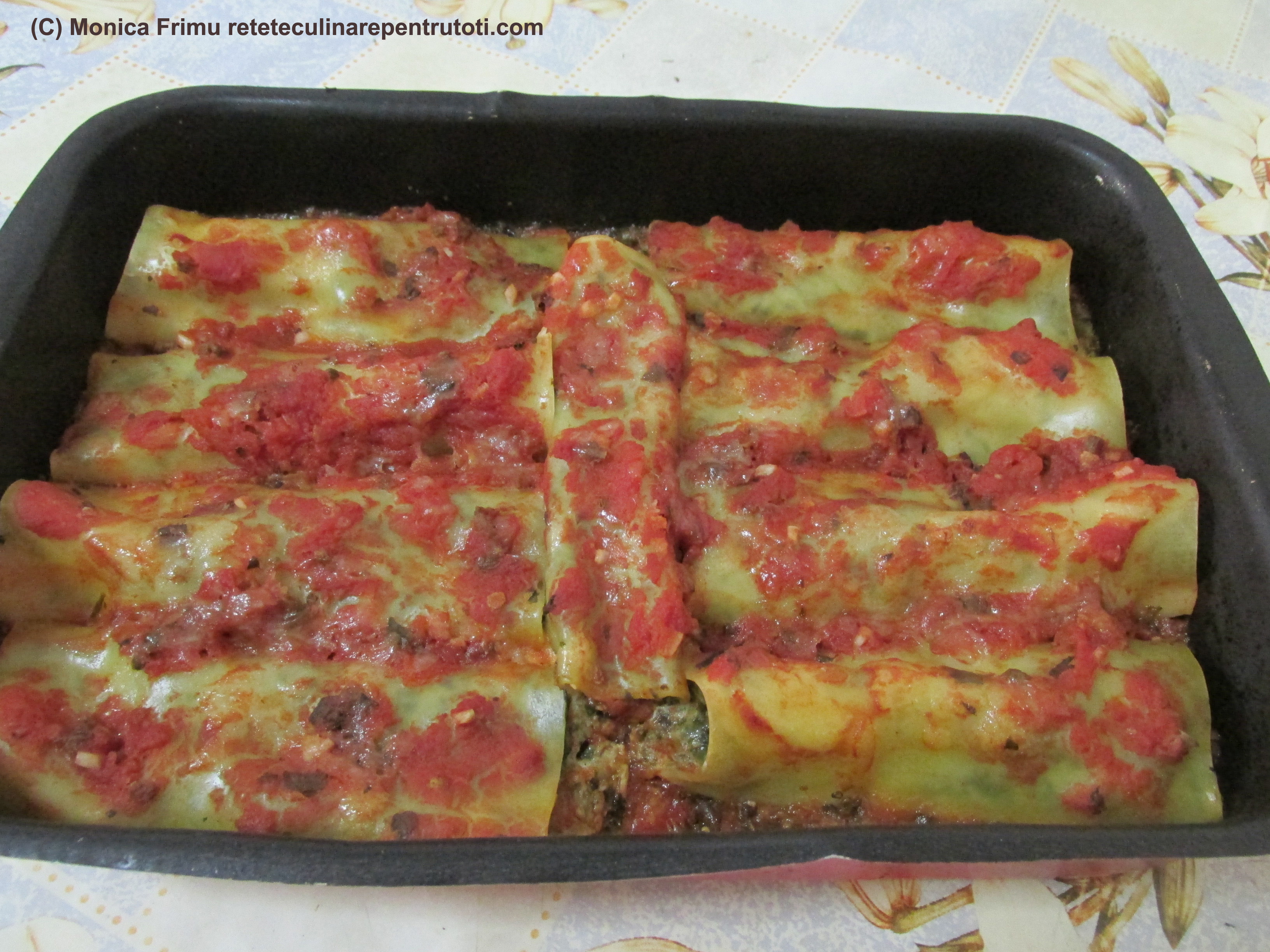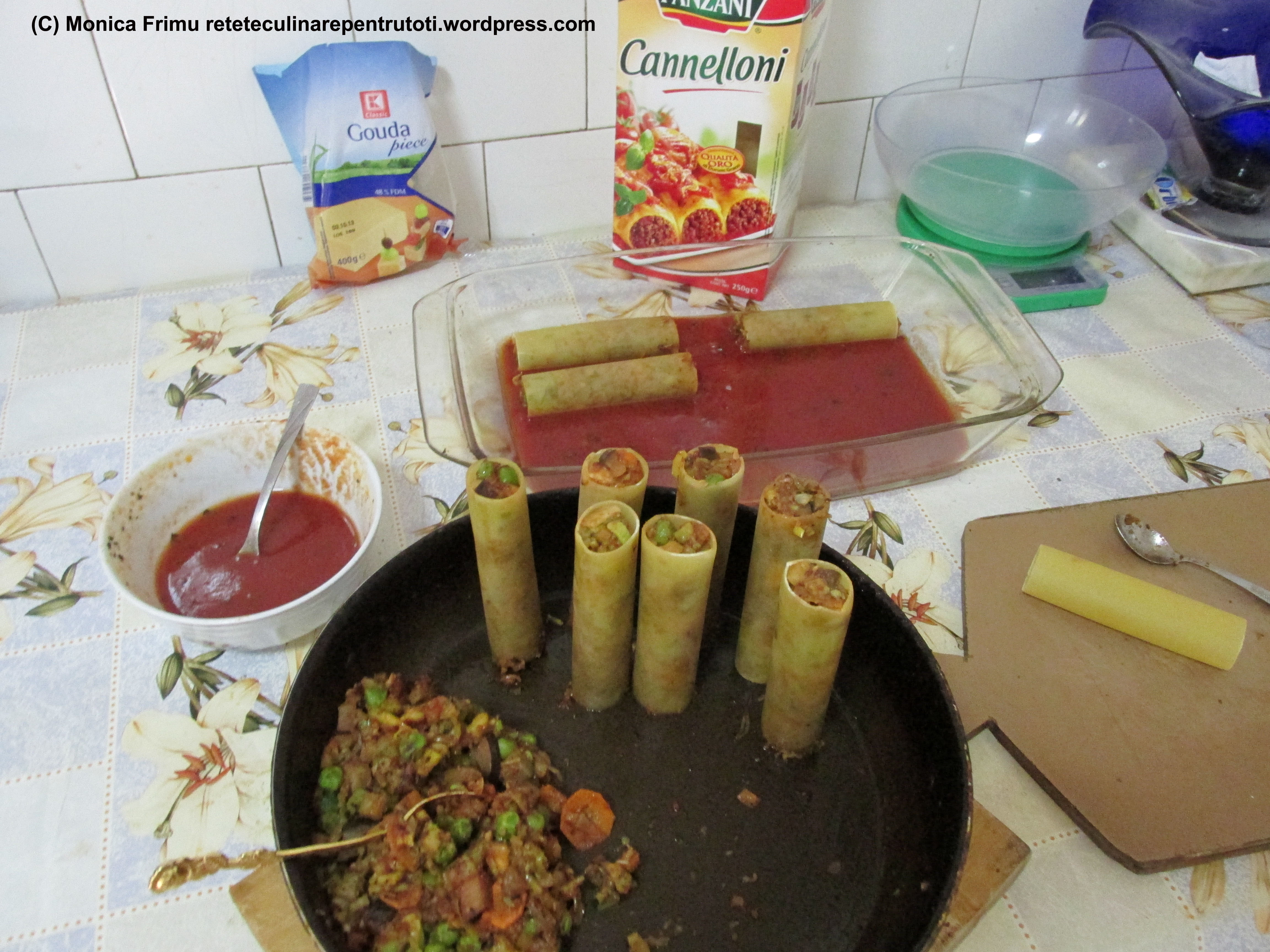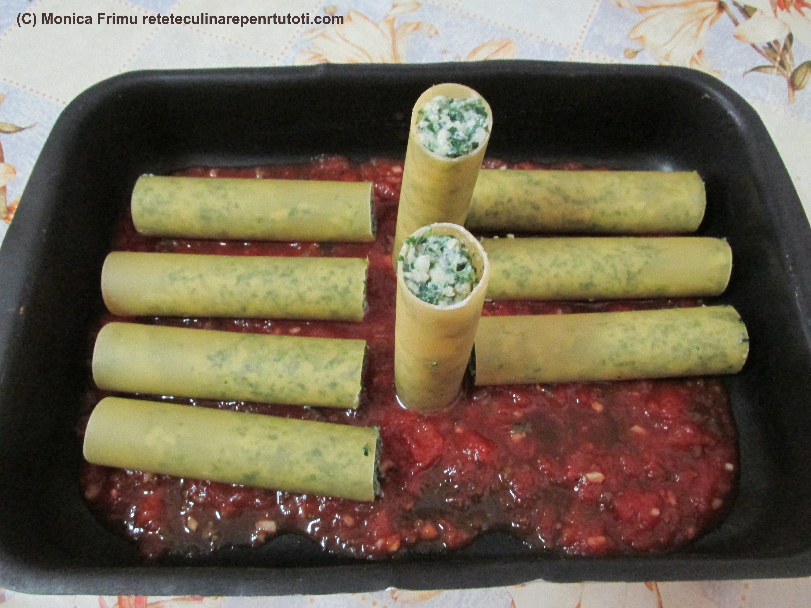 Pe fundul unui vas Yena întindem un strat de sos, așezăm unul lângă celălalt cannelloni umpluți, deasupra întindem uniform restul de sos și presărăm cașcavlul ras mic. Punem în cuptorul preîncălzit la foc mediu (180) aproximativ 35 minute. Scoatem și lăsăm să stea 10 minute. Porționăm și servim.