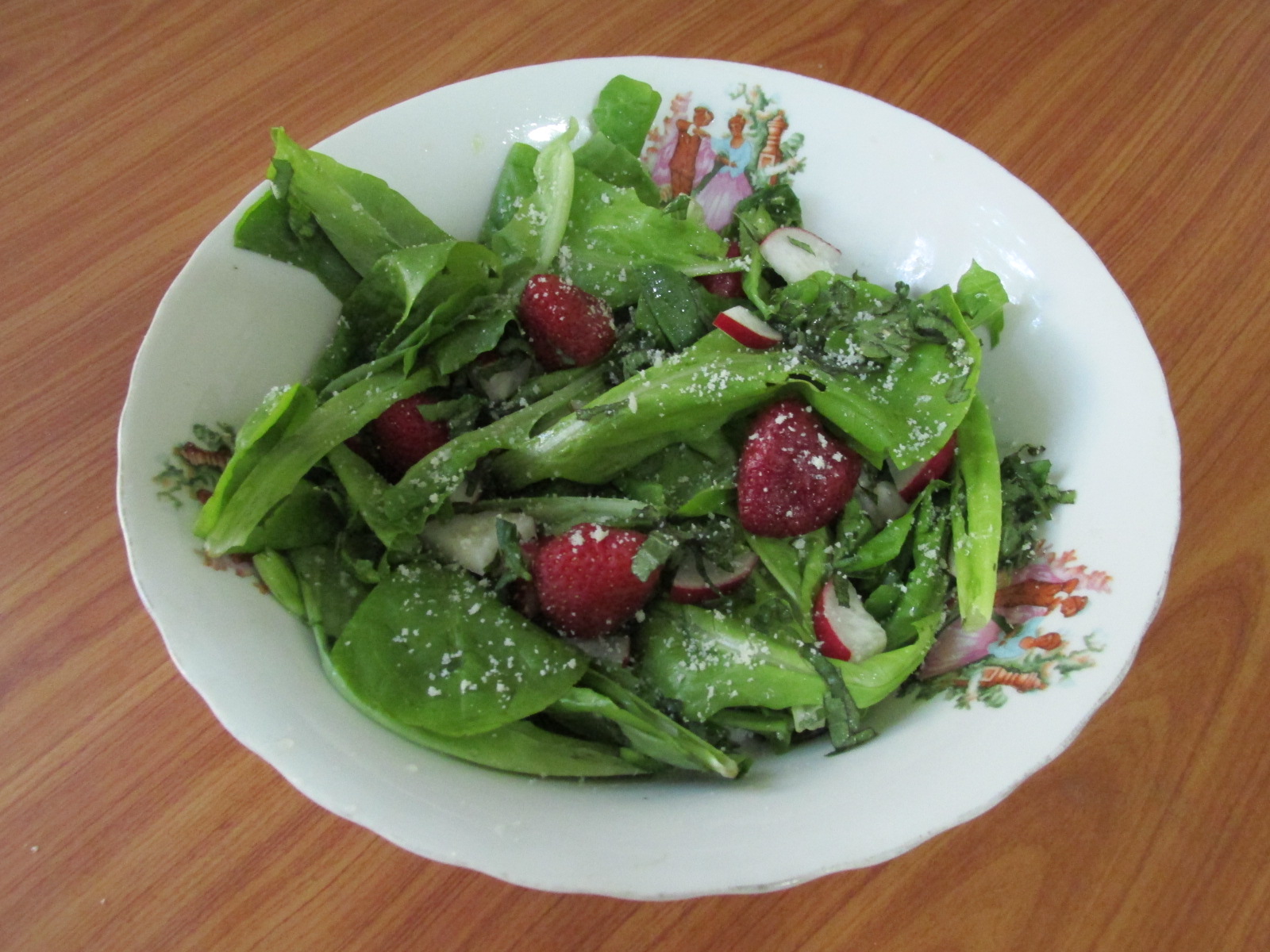 Spălăm frunze proaspete și crude de salată verde, le punem într-un bol. Tăiem 1/2, apoi rondele ridichi, rupem frunze de mentă și le amestecăm în bol. Stropim cu sos Wurze, adăugăm căpșuni și presărăm parmezan ras. Lăsăm să stea 15 min. și servim.