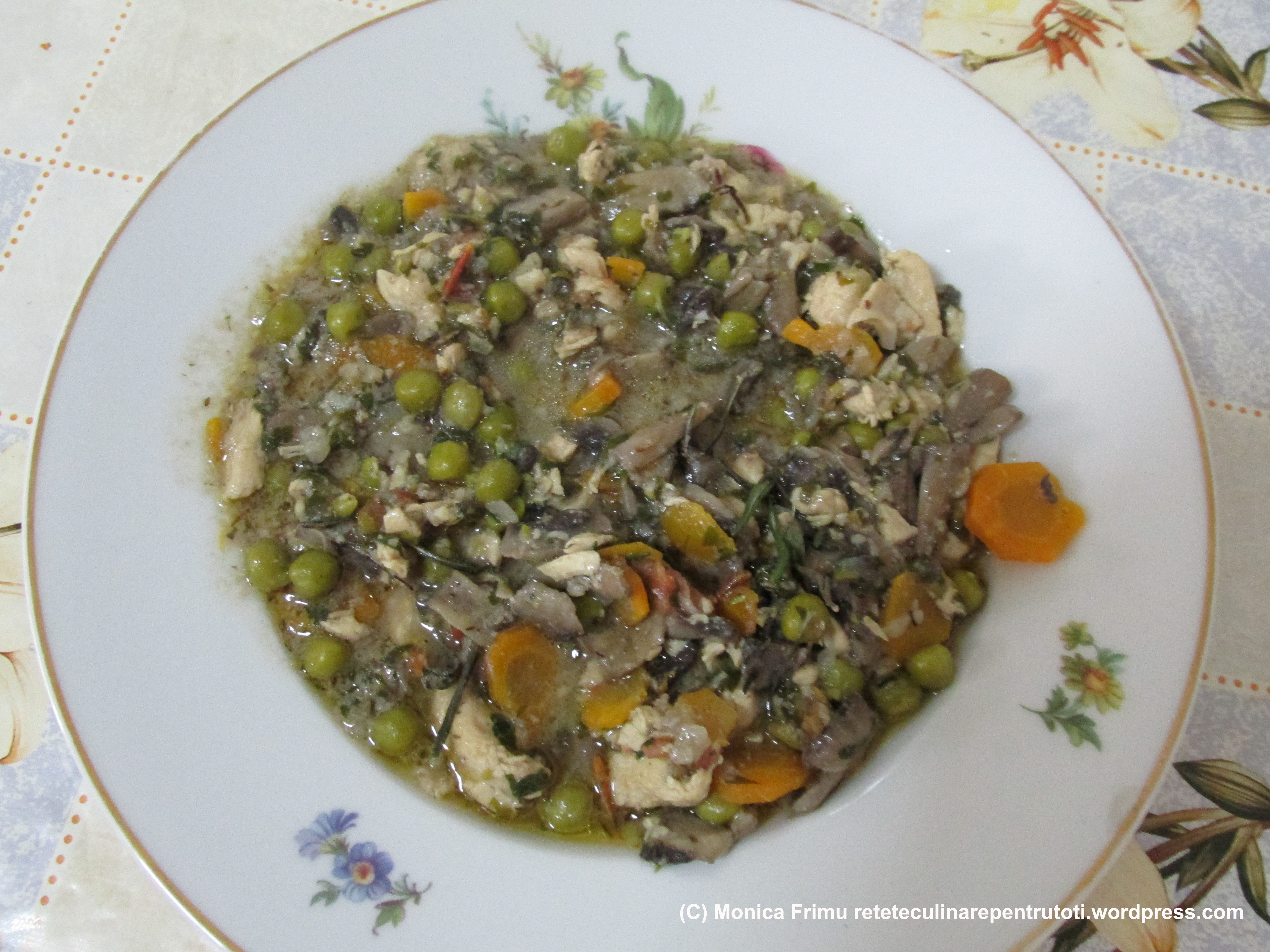 – 500 g piept de pui, 500 g ciuperci, 2 linguri făină, 1 morcov, 1 roşie, 100 g boabe de mazăre, 1 ceapă, 1 linguriţă muştar, cimbrişor, 1/2 leg. pătrunjel verde, sare, piper, 100 ml ulei