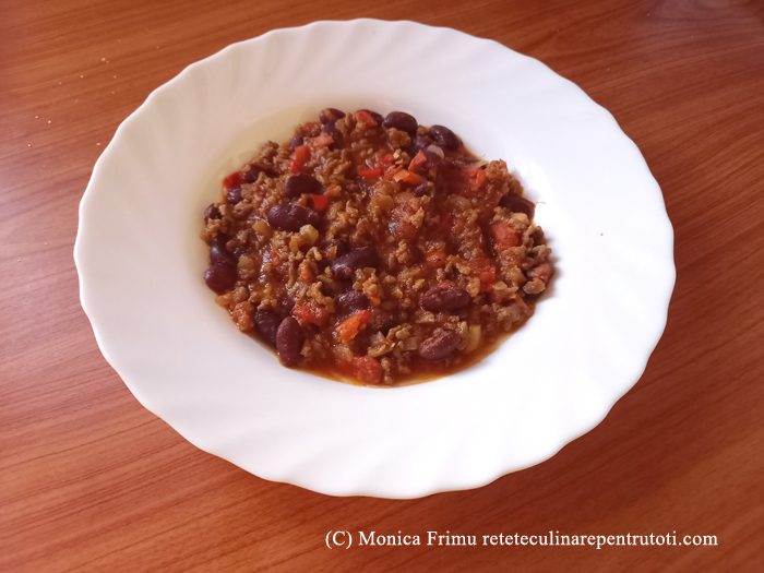 – 500 g carne de vită măcinată, 1 ceapă albă mare (170 g), 2 căței de usturoi (10 g), 1 conservă fasole roșie (400 g), 1 conservă roșii cuburi (400), 1 ardei gras (180 g), 2 ardei chili uscați, câte o linguriță boia de ardei dulce, chimion măcinat și oregano uscat, 2-3 linguri ulei de măsline, sare, piper, apă