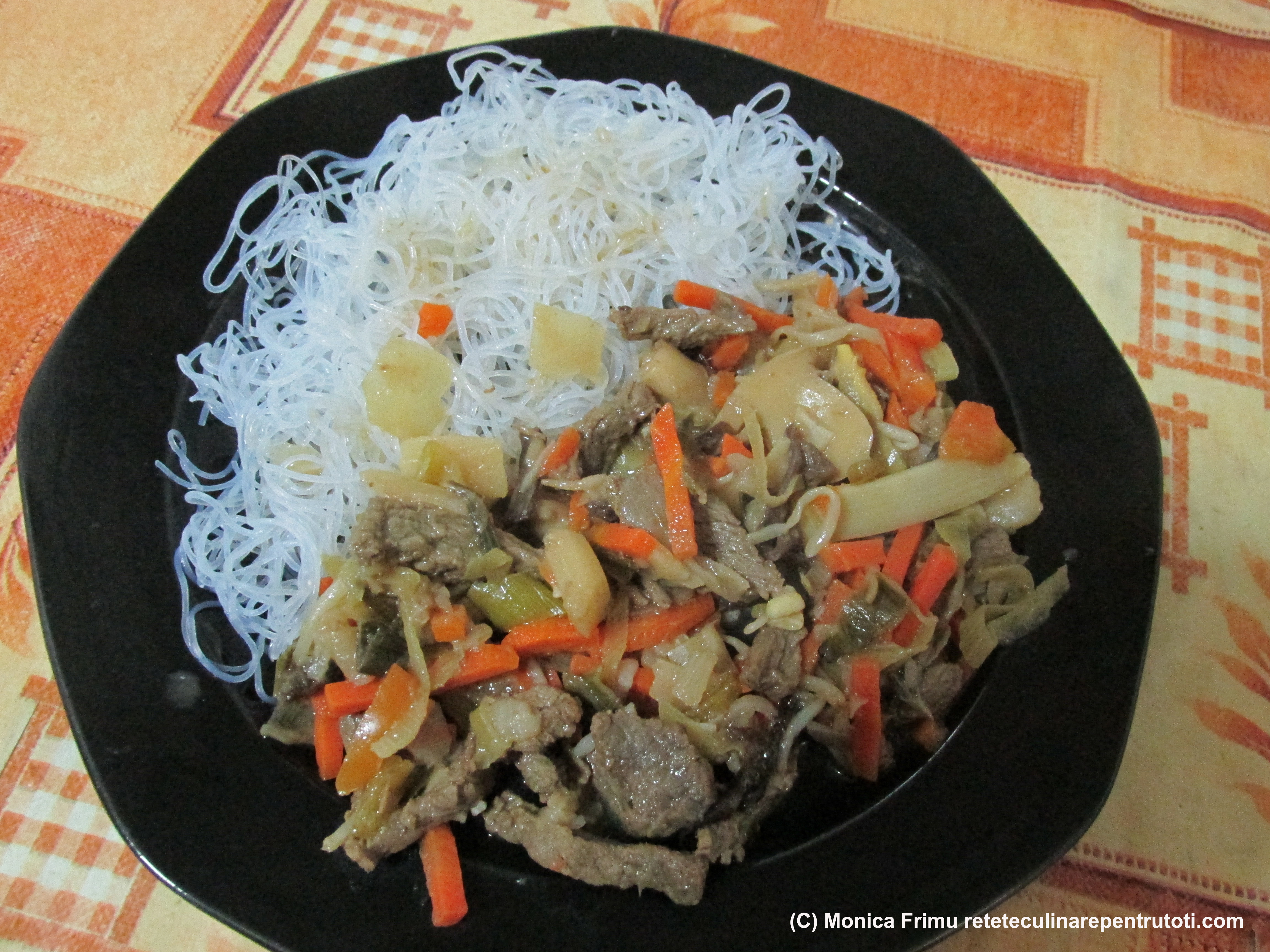 – 400 g carne de vită (șnițel), 50 g ciuperci Mun (uscate), 200 ml supă de vită, 1 varză Bok Choy, 1 ardei roșu, 1 leg. ceapă verde (6-7 fire), 3 linguri sos de soia, 1 lingură ulei de susan, 5 linguri ulei de arahide, 1 lingură făină de porumb, 1 ½ linguri pastă de ghimbir cu usturoi, fulgi de ardei iuți; pt. servit tăiței de orez
