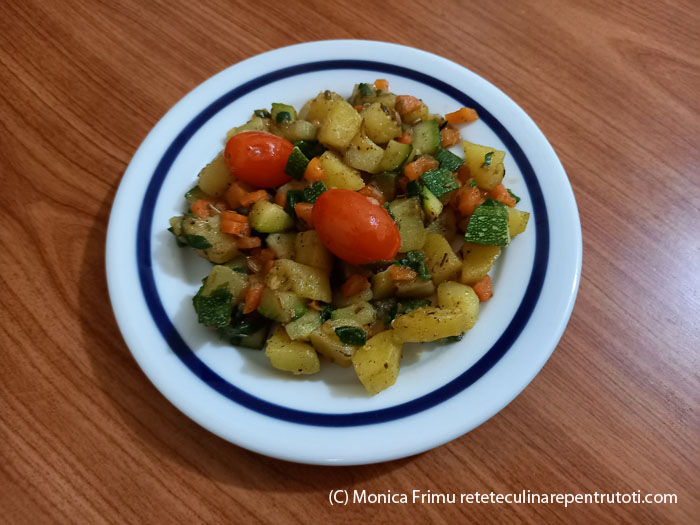 – 300 g cartofi albi, 1 zucchini (200 g), 2 cepe verzi (50 g), 100 g morcovi, 50 g roșii cireașă, câte 1 linguriță semințe de fenicul și ierburi de Provence uscate, câte ½ linguriță praf de chimen, boia de ardei iute și piper negru măcinat, 2 linguri ulei, sare, apă