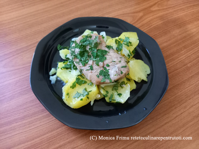 Tăiem carnea în 4 felii, presărăm sare, piper, turnăm 2 linguri ulei, acoperim și punem în frigider până a doua zi. Scoatem la temperatura camerei cu 30 minute înainte de a găti. Curățăm și tăiem cartofii rondele mai subțiri, ceapa ½, apoi feliuțe subțiri. Tocăm mărunt pătrunjelul. Ungem o tavă cu ulei, acoperim fundul cu cartofi, peste presărăm ceapa și sare după gust. Deasupra așezăm feliile de carne. Turnăm 150 ml apă, acoperim cu folie de aluminiu și punem în cuptorul preîncălzit la foc mai mare (200) 35 minute. Îndepărtăm folia, presărăm pătrunjelul și punem în cuptor până se evaporă lichidul, aproximativ 10-15 minute. Porționăm și servim.