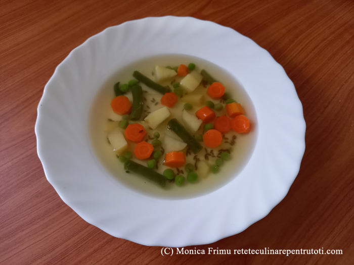 – 200 g cartofi, 250 g morcovi, 80 g păstârnac, 50 g fasole verde congelată, 50 g mazăre congelată, 2 linguri semințe de chimen, 1 lingură Secretul Gustului, sare, piper, 1,5 l apă