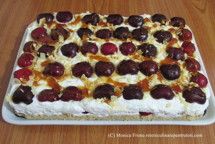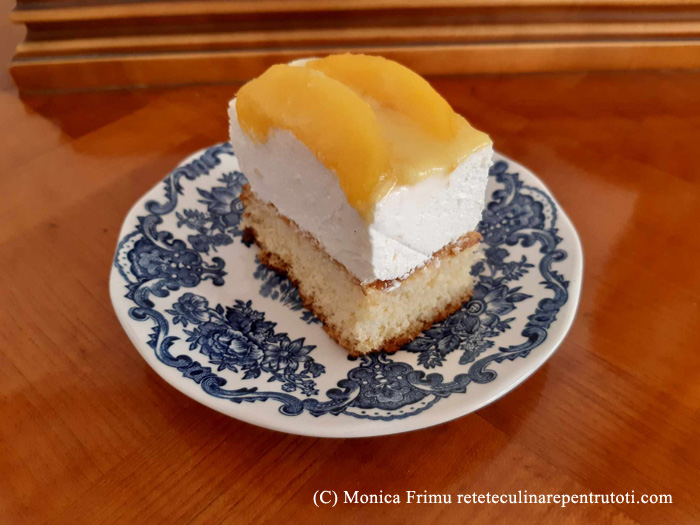 – 4 ouă, 120 g zahăr tos, 100 g zahăr praf, 1 plic zahăr vanilat, 220 g făină, 1 plic praf de copt, 250 g ricotta, 100 g ciocolată albă, 350 ml frișcă, 250 g gem de piersici și portocale, 2 linguri ulei, sare