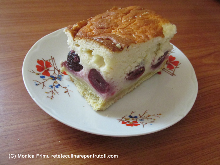 Preparăm crema. Amestecăm făina cu laptele rece, adăugăm gălbenușurile, zahărul, smântâna și zahărul vanilat și omogenizăm. Separat, mixăm albușurile spumă tare, cu un praf de sare, le încorporăm în compoziția cu gălbenușuri și turnăm peste cireșe uniform. Punem în cuptorul preîncălzit la foc mai mare (200) aprox. 25 min. (testul cu scobitoarea). Răcim, îndepărtăm hârtia și scoatem pe un platou. Porționăm și servim.